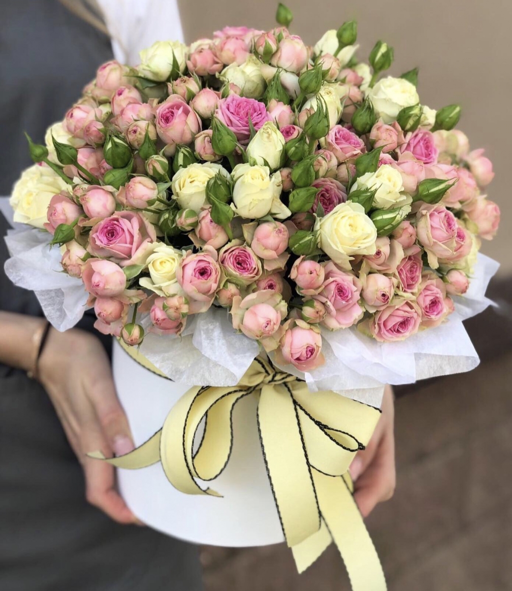 Нежно розовые кустовые розы обрамляются линиями белых бутонов, что отражает их красоту и величественность. Этот букет будто рассказывает о нежности и любви!